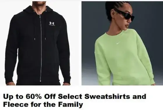 Super savings! Shop in store and get up to 60% off select sweatshirts and fleece for the family.